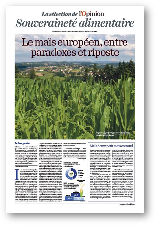 La sélection du quotidien l’Opinion du 26 juin est consacrée au maïs. Intitulé « Le maïs européen, entre paradoxe et riposte ». Ce dossier montre le rôle du maïs dans la souveraineté alimentaire française et européenne et sensibilise le lecteur aux distorsions de concurrences qui grèvent les performances des agriculteurs français. Mais au-delà des difficultés, il révèle l’excellence de notre maïsiculture et de notre production de semences. Emmanuelle Ducros, journaliste d’investigation particulièrement investie sur les sujets touchant à la science, l’alimentation et la santé, a interviewé un beau panel d’experts tels que l’économiste Sébastien Abis, la sénatrice Sophie Primas et des présidents de la filière.